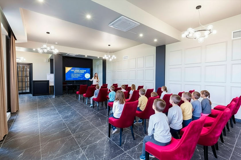 - Учебных сессий для интеллектуальных, иностранных и других школ: мы предлагаем комфортные и современные классы, идеально подходящие для организации образовательных мероприятий, лекций, семинаров. У нас вы встретите обучающую атмосферу, тишину и комфорт для концентрации, а также возможности для активного отдыха и культурной программы