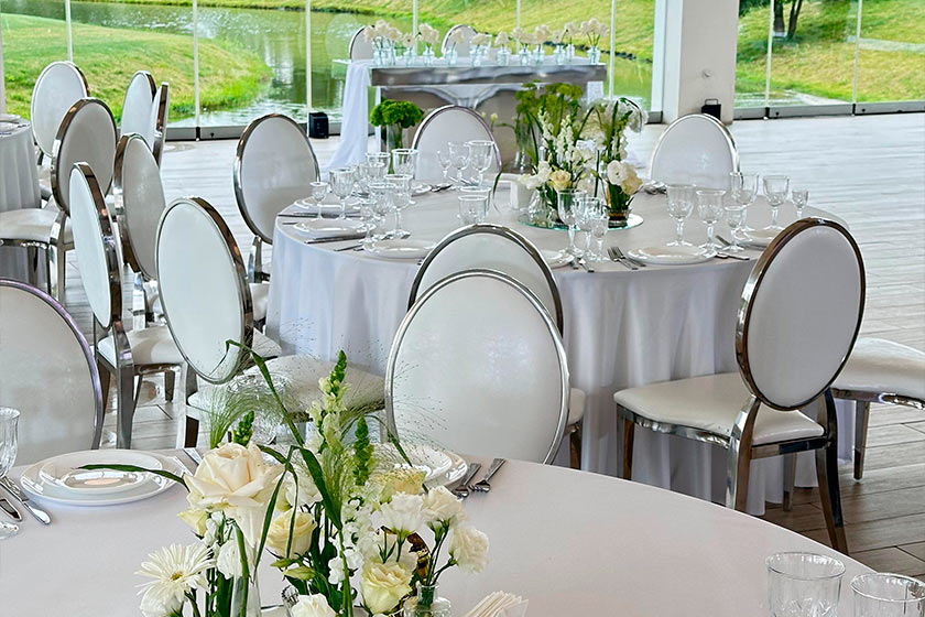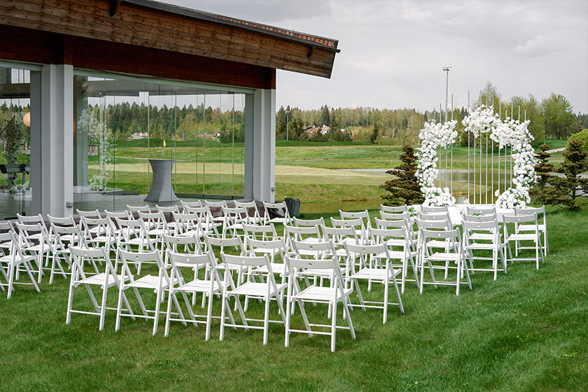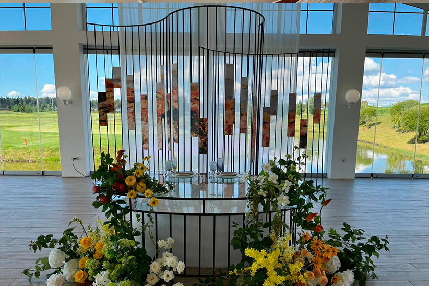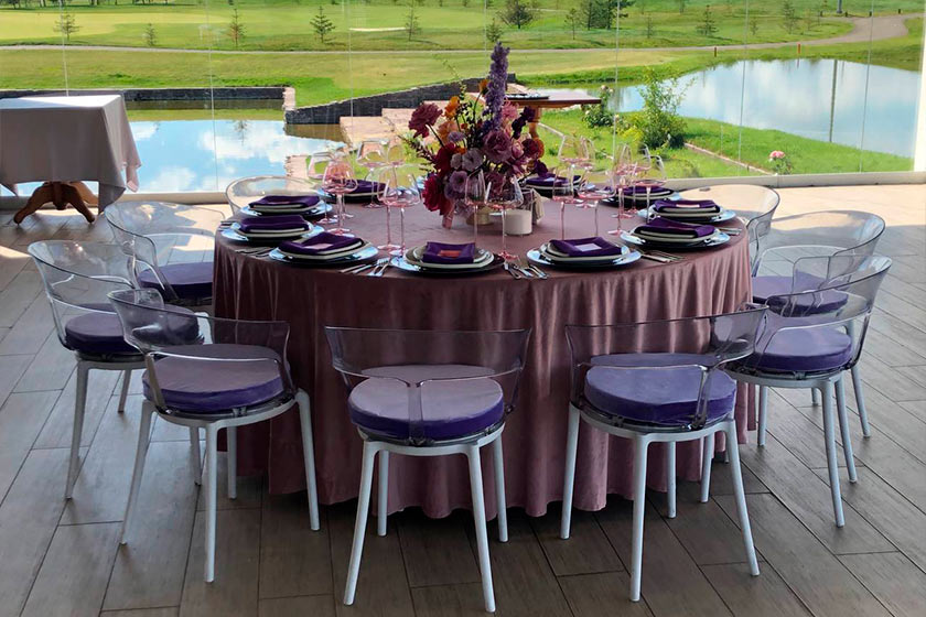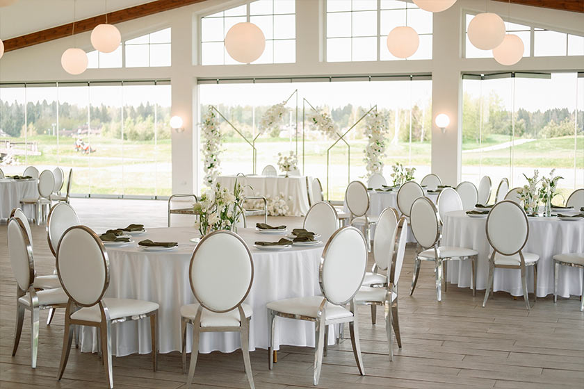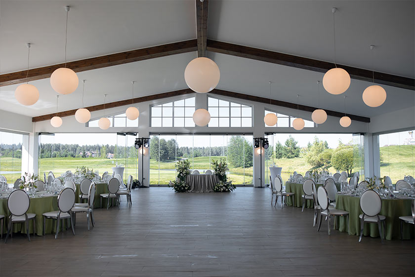 Романтическое пространство: зал площадью 420 кв.м. с высотой потолков 7 метров и панорамным остеклением, откуда открывается захватывающий вид на гольф-поле. Идеально для банкетов от 30 до 180 человек