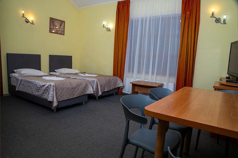 Проходная спальня на 1 этаже с обеденным столом, двумя кроватями